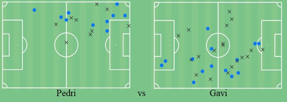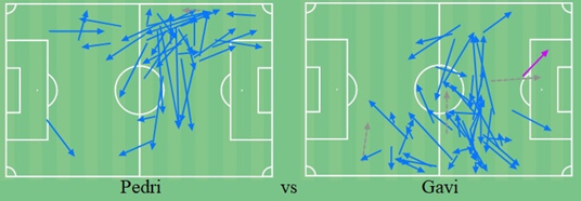 我们在上面看到的决斗地图也许能对这种情况有更多的启示。当然,这不是一个平均地图,而是一个孤立的比赛例子,所以样本可能会因比赛而异。然而,虽然两名球员都有很强的线间存在感,但加维倾向于回撤更深,而佩德里则是推进到更高的位置,并更多地攻击禁区。
