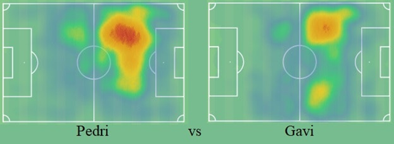 佩德里和加维通过不同的品质完美地体现了这一点。让我们从基本的移动和空间占用开始。下面是一张热图,我们可以用它来比较两人在球场上的活动趋势,我们可以马上看到他们在这方面确实是相似的。