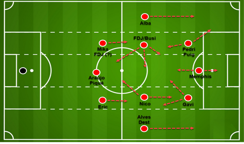 但是让我们假设哈维想要完全复制阿尔萨德的模式,三个中卫,两个后腰顶在前面,然后是两个内线/内锋,而不是天然的边锋。上图是可能是他最理想的首发阵容。佩德里和加维都是优秀的内线球员,他们也都可以扮演中锋或伪边锋的角色。
