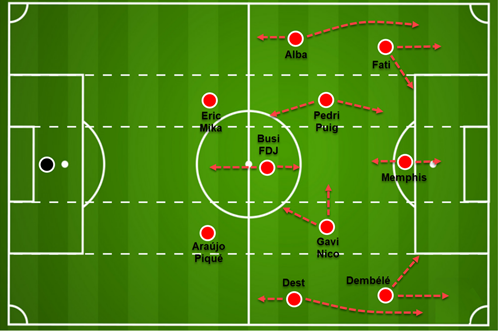 他在前场的位置上不会那么飘忽不定,而是更有控制力,在球场深处有很强的抗压能力。耐人寻味的是,这可能是为数不多的能够完全利用巴萨惊人的中场深度的体系之一。对于哈维来说,没有太多的方法可以让德容、尼科、佩德里和加维这四个人同时出场,但有了前两名球员和后两名球员组成的双支点,这是可以做到的。