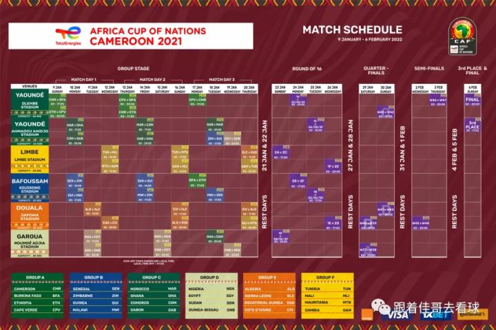 赛程:揭幕战1月9日当地时间17点(北京时间+7)东道主喀麦隆迎战布基纳法索,决赛2月6日当地时间20点,具体赛程表如下: