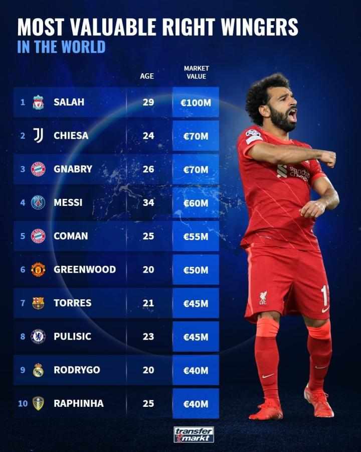 世界足坛右边锋最新身价榜:萨拉赫1亿欧居首,梅西列第四