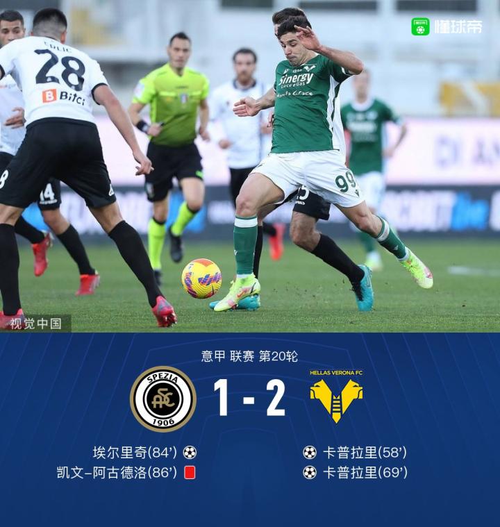 北京时间2022年1月6日21:30,意甲第20轮,斯佩齐亚主场迎战维罗。上半场,双方互有攻守,维罗纳攻势更胜,拉佐维奇中楣;下半场,维罗纳反击由卡普拉里打入一球,随后卡普拉里又在禁区外围远射再下一城,埃尔里奇扳回一城,凯文-阿古德洛染红,最终,斯佩齐亚主场1-2不敌维罗纳。