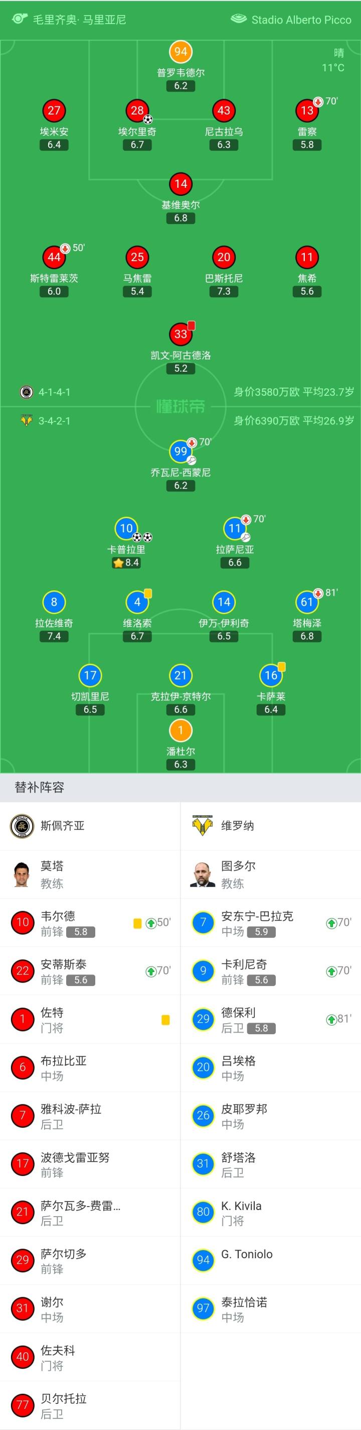 维罗纳首发:1-潘杜尔、16-卡萨莱、21-克拉伊-京特尔、17-切凯里尼、8-拉佐维奇、4-维洛索、14-伊万-伊利奇、61-塔梅泽、11-拉萨尼亚、10-卡普拉里、99-乔瓦尼-西蒙尼