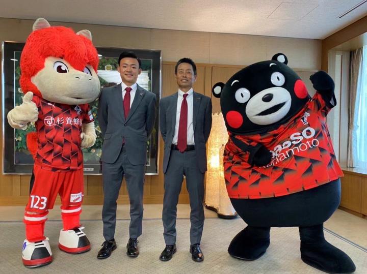 公务繁忙的部长,上个月还身披55号球衣出席了J3最后一轮熊本深红的主场比赛。要知道J联赛早就打破次元壁,形成独特的足球文化了。
