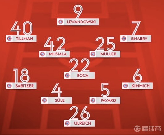 上半程机会很少的西班牙中场罗卡坐镇中场中路,他的身前是穆勒和小将穆夏拉,左右边锋位置由小将蒂尔曼和格纳布里担任,莱万突前。