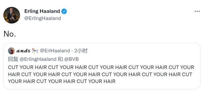 哈兰德飘逸的秀发引起了球迷关注。有女球迷在哈兰德的主页下回复:“是时候剪头发了。”这名球迷非常激动,她再次回复哈兰德:“剪头发 剪头发 剪头发 剪头发”一共用了12个剪头发。对此哈兰德的回应也是言简意赅,哈兰德回复了一个字:“不”。