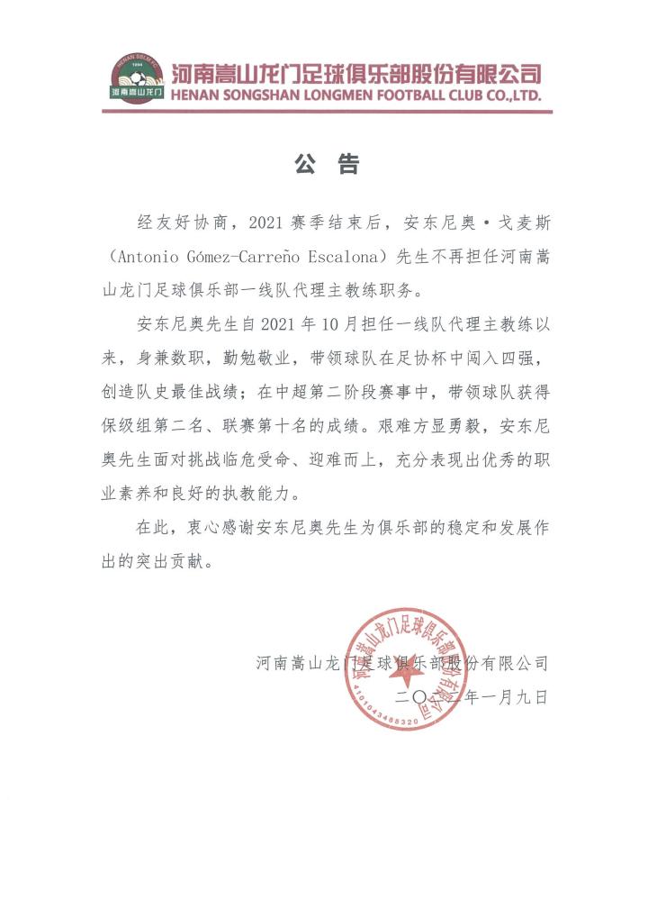 经友好协商,2021赛季结束后,安东尼奥·戈麦斯(Antonio Gómez-Carreño Escalona)先生不再担任河南嵩山龙门足球俱乐部一线队代理主教练职务。