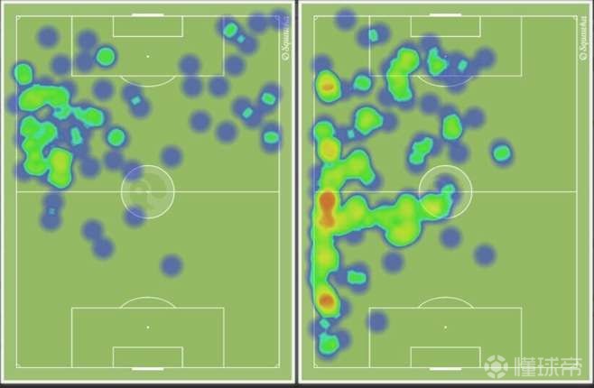 (图)左阿扎尔跑动热点图,右科尔曼克莱维利跑动热点图