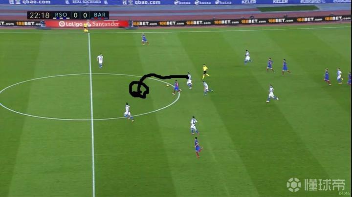 (图)皇家社会的防守球员,对防守位置提前预判,在威胁区域对MSN进攻进行了有效的拦截