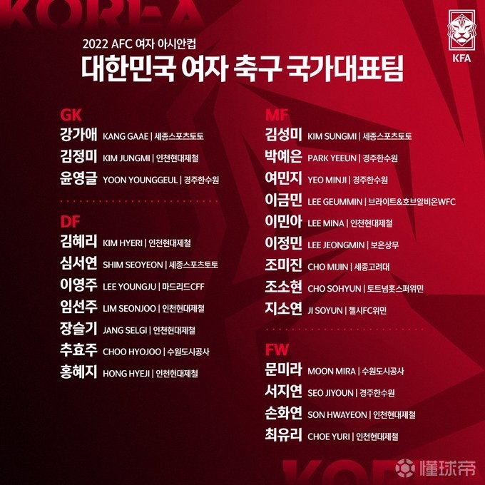 韩国女足亚洲杯大名单:池笑然、赵昭贤领衔,李玟娥入选