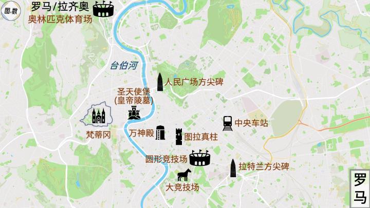 奥林匹克体育场现在的容量约7万人,其位于罗马核心区的西北部,与梵蒂冈一样位于台伯河西岸,背靠马里奥山,图中左侧的绿色植被就是马里奥山上的森林。
