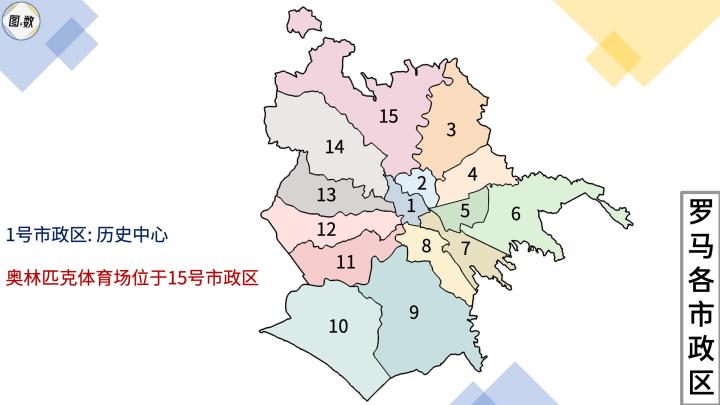 罗马分为15个市政区,其中1号市政区是历史中心,2号市政区是市中心的北部地区,其他3号至15号市政区围绕1号区和2号区呈顺时针排列,罗马和拉齐奥就位于15号市政区最南端,毗邻1号市政区。