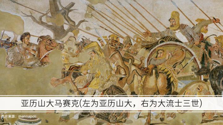 这幅面积约14平方米的马赛克镶嵌画使用了数十万块微型瓷砖,描绘的是马其顿与波斯之间的伊苏斯战役,骑马的亚历山大大帝位于左侧,而乘坐战车的大流士三世位于右侧,如此主题宏大的美术精品,在当时居然只是用作地板,罗马权贵的奢华可见一斑。