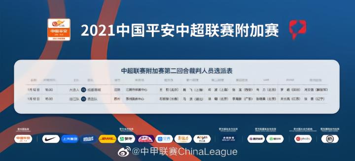 1月12日15:30,2021中超、中甲联赛升降级附加赛次回合将如期进行。在足协杯决赛上演之后,这也是跨年绿茵赛事的终极一战。1月11日下午,中超官方公布了这2场比赛的裁判人员选派安排。
