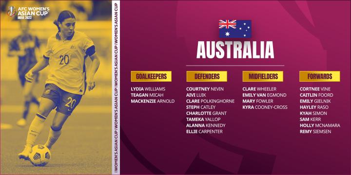 前锋:瓦因(悉尼FC)、凯特琳-福尔德(英格兰-阿森纳)、吉尔尼克(英格兰-阿斯顿维拉)、海莉-拉索(英格兰-曼城)、凯娅-西蒙(英格兰-托特纳姆热刺)、山姆-克尔(英格兰-切尔西)、麦克纳马拉(墨尔本城)、西姆森(悉尼FC)