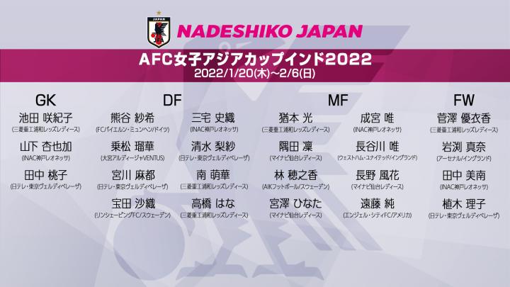 前锋:菅泽 优衣香(浦和红钻)、岩渊 真奈(英格兰-阿森纳)、田中 美南(神户雌狮)、植木 理子(日视美人)