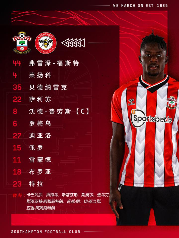 2021/22赛季英超第18轮 | 南安普顿 v...南安普顿足球俱乐部 @懂球帝2022-01-12 02:462021/22赛季英超第18轮 | 南安普顿 vs 布伦特福德首发公布! 首发:弗雷泽-福斯特、莱扬科、贝德纳雷克、萨利苏、沃德-普劳斯【C】、罗梅乌、迪亚洛、佩罗、雷蒙德、布罗亚、特拉展开更多