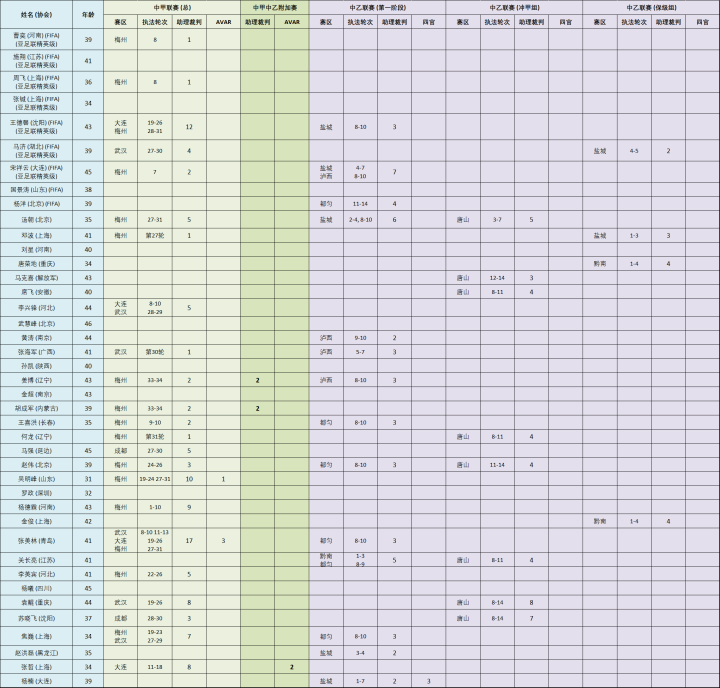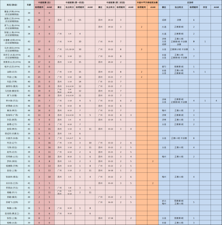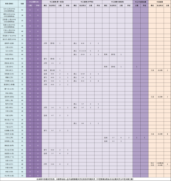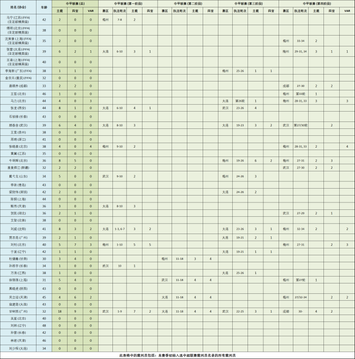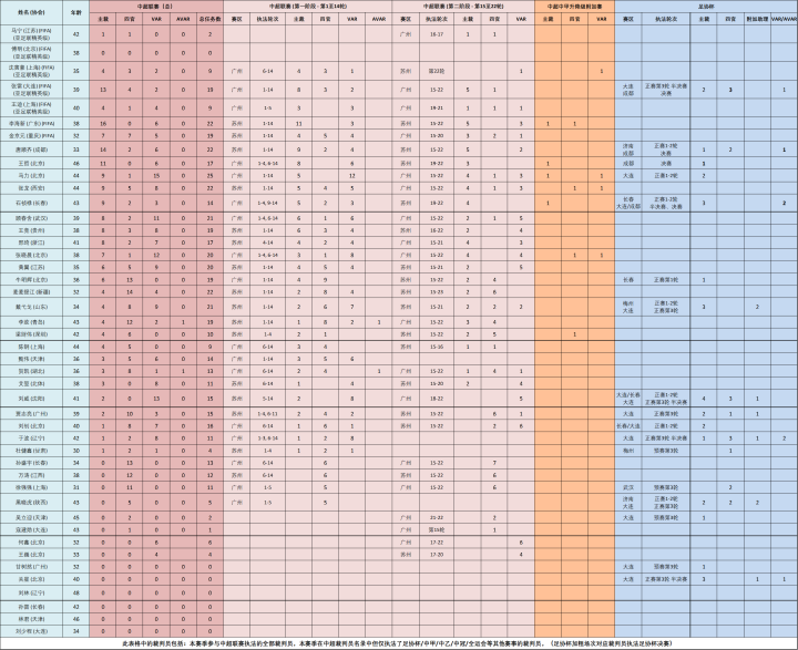 首先是本赛季中超联赛裁判员、助理裁判员执法数据总结