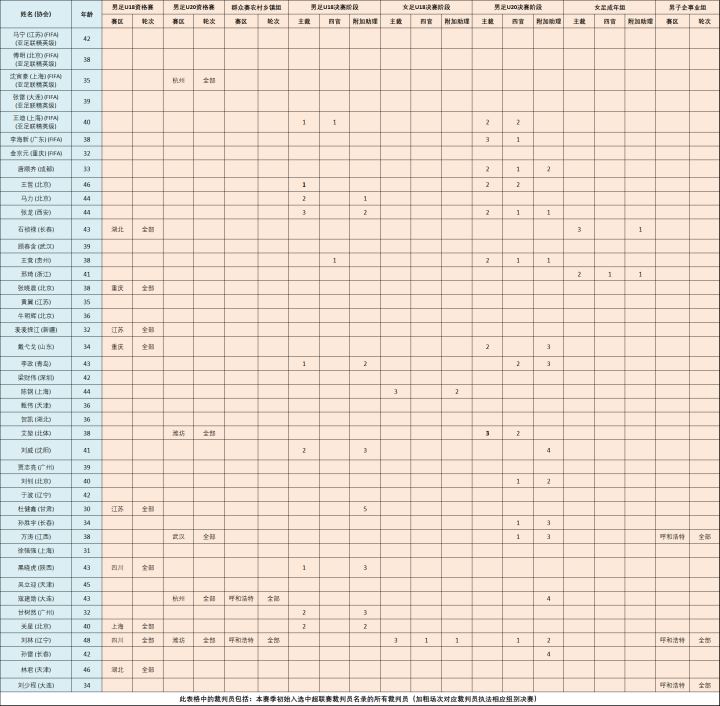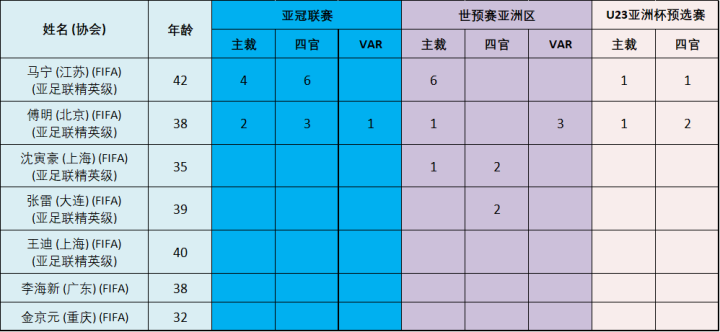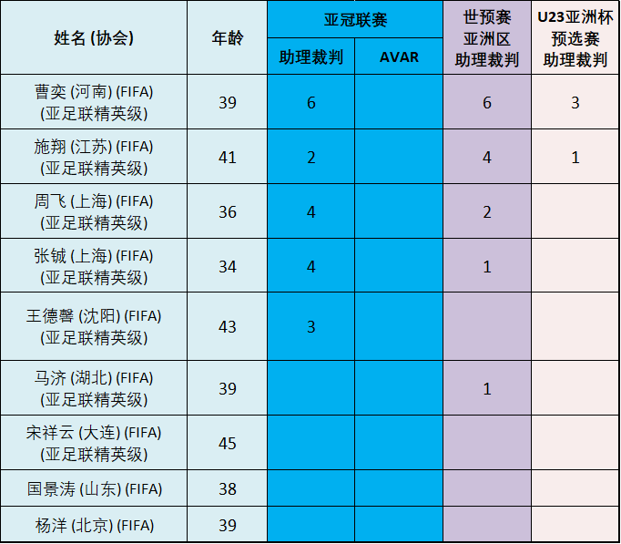 国际级助理裁判员方面,45岁的精英助理宋祥云和39岁的杨洋被撤下,宋祥云年满45岁,给年轻人让出了位置,而杨洋本赛季由于种种原因,未参与中超联赛执法,且不是亚足联精英级助理裁判员,撤销国际级报名可以理解。