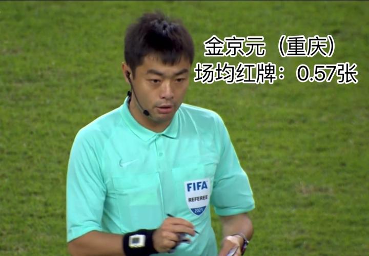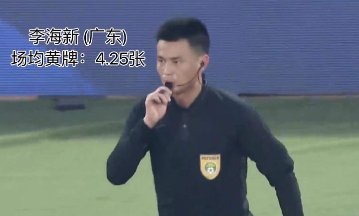 在本赛季中超执哨大于等于5场的共计14名裁判员中,李海新的场均黄牌数最高,达到了每场4.25张,而金京元则是“最爱”出红牌的裁判员,7场中超共出示4张红牌,场均红牌数超过了0.5张。