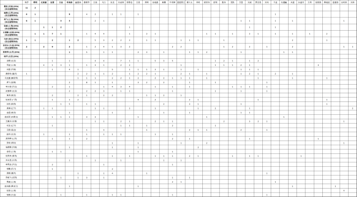 (图)中超助理裁判与裁判员搭档执法各项赛事场次记录:横轴为裁判员,纵轴为助理裁判员 (粗体为国际级裁判员)