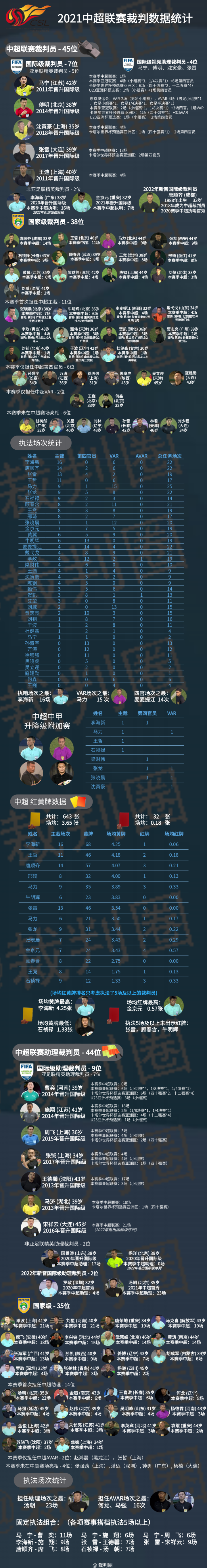 裁判圈2021年4月20日,本赛季中超联赛在广州天河体育场正式开打,46岁的裁判员王哲连续两年执法中超揭幕战。2022年1月9日,同样是王哲,以主裁的身份执法了山东泰山与上海海港的足协杯决赛。1月12日,随着两场中超中甲升降级附加赛的结束,这个长达将近9个月的“跨年赛季”终于画上了句号。裁判圈今年继续给大家带来中超联赛裁判员、助理裁判员的执法数据统计。