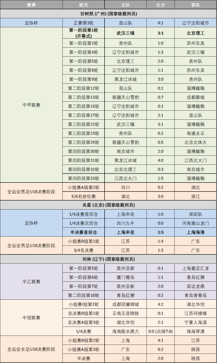 赛会制比赛下,除中超外,中超联赛裁判员负责中甲、中乙、甚至中冠联赛的执法已经成为常态,本赛季共有26名中超裁判员参与中甲执法,21名参与执法中乙联赛,4人执法中冠联赛。今年恰逢陕西十四运,为保证全运会十一人制足球比赛的高质量进行,共计选派30名中超裁判员参与全运会十一人制足球项目各个年龄组比赛的执法工作。(由于王巍、何鑫赛季开始前未入选中超裁判员名单,故未统计二人其他赛事的执法数据)