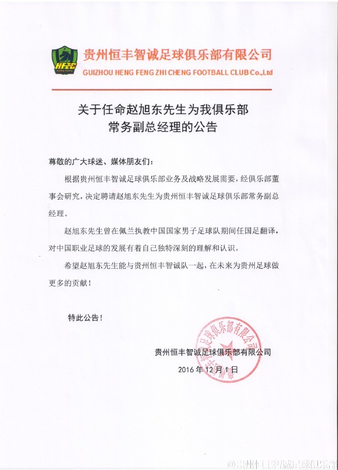 公告称:根据贵州恒丰智诚足球俱乐部业务及战略发展需要,经俱乐部董事会研究,决定聘请赵旭东先生为贵州恒丰智诚足球俱乐部常务副总经理。