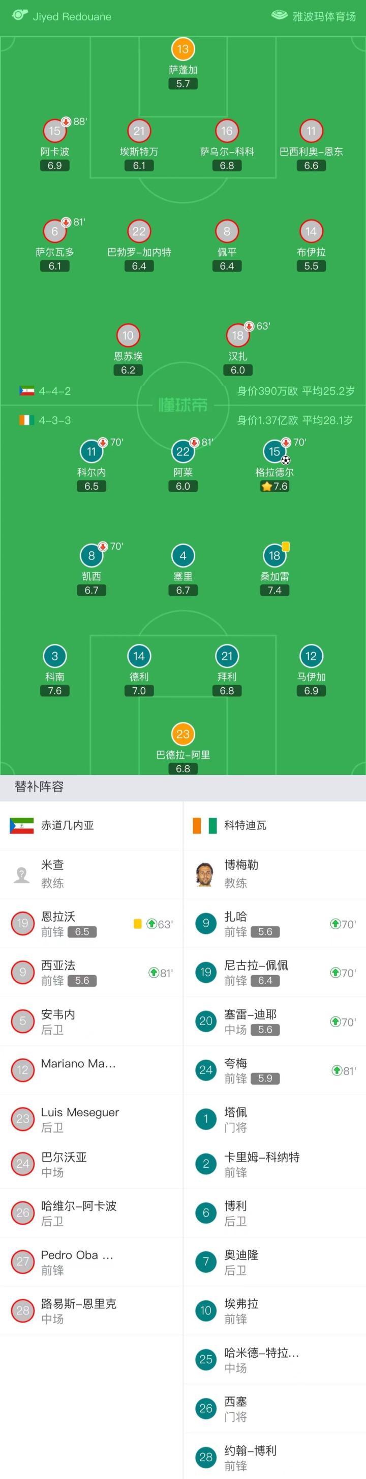 科特迪瓦首发:23-巴德拉-阿里、12-马伊加、14-德利、21-拜利、3-科南、4-塞里、8-凯西(70'20-塞雷-迪耶)、18-桑加雷、11-科尔内(70'9-扎哈)、22-阿莱(81'24-夸梅)、15-格拉德尔(70'19-尼古拉-佩佩)