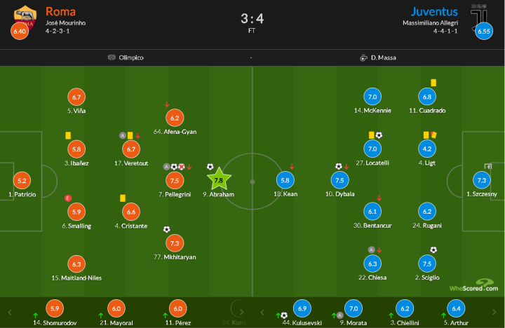 罗马此前的所有努力在七分钟内全部崩溃。当尤文用阿图尔和莫拉塔换下本坦库尔和小基恩,他们全部的能量都被激活了。尽管阿图尔在控球和低位组织做得更好,但是闪光的一定是莫拉塔在进攻三区中的贡献。