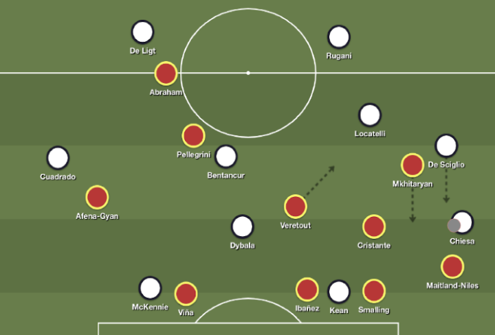 相比于罗马在前场的制造的进球威胁,尤文图斯在建立进攻时做得更好。罗马在前场的两人很少给出太多的压迫。克里斯坦特和韦勒图分别盯着尤文的双支点,佩莱格里尼偶尔的缺位就会使中场失势,给了迪巴拉很多活动的空间。