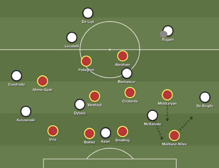当罗马将球转移到边路,尤文的一个边后卫就会到外侧施压,此时一条穿过半场的通道被打开了。在右路,姆西塔良在右侧的半空间(指中场和边侧之间的肋部)摆脱了了盯防,移动到了德西利奥顶出之后空出的空间去接梅特兰·奈尔斯的传球。这就要求鲁加尼跟出去,禁区里因此留下了很大的空当。不过如果基耶萨能够积极一些跟住奈尔斯,尤文在结构上就会处于更好的位置。罗马自己也面临着类似的防守问题,特别是当他们的边后卫站出来施压时。