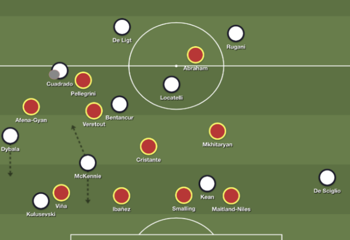 穆里尼奥用一个3-5-2开启了比赛,不过实际踢起来还是4-2-3-1,克里斯坦特和韦勒图配搭双后腰,佩莱格里尼的位置更为靠前。在他们身后是奈尔斯、伊巴涅斯、斯莫林和比尼亚。突前的三个人分别是姆西塔良、亚伯拉罕和小吉安。