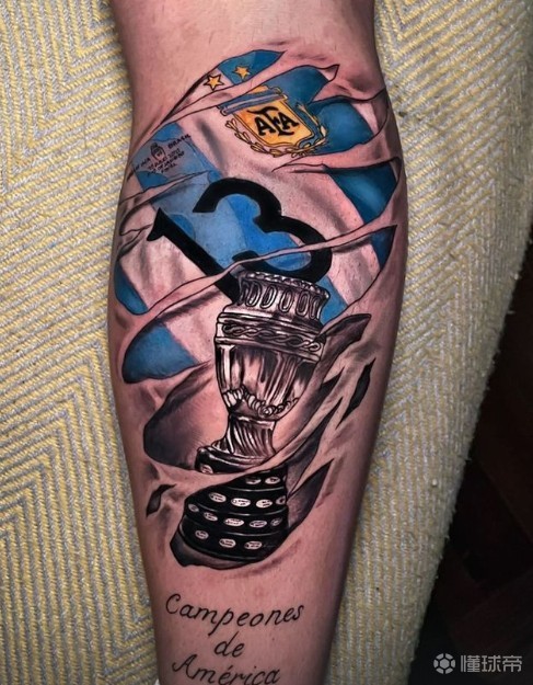 荣耀时刻,也是难忘的回忆。为了永恒地去纪念,克里斯蒂安-罗梅罗在小腿处文上了美洲杯奖杯以及他的13号阿根廷球衣。