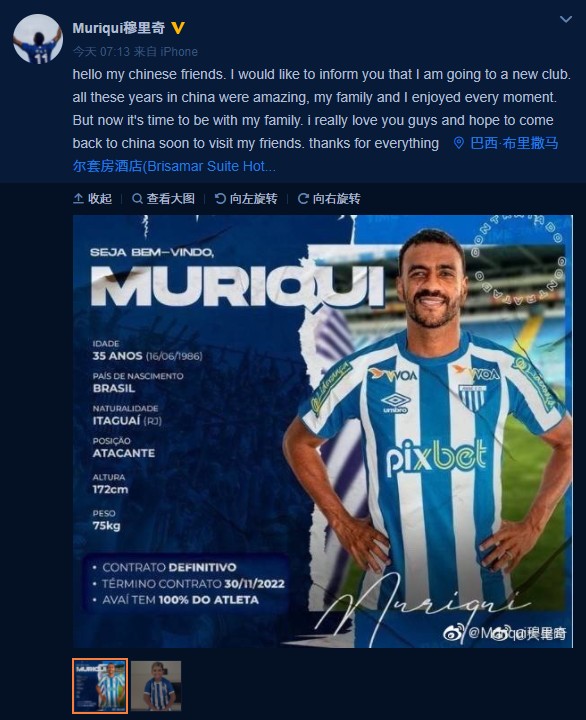 穆里奇在个人社媒动情写道:“你们好,我在中国的朋友们。我想告诉你们,我将前往一家新的俱乐部。在中国的这些年是令人惊奇的,我和我的家人享受在这里的每一刻,但现在是时候和我的家人在一起了。我真的很爱你们,希望能尽快回到中国来看望我的朋友们。”