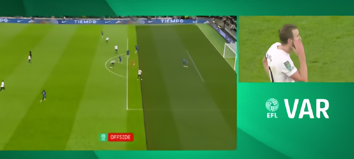 通过慢镜头可以看到,在卢卡斯传球一瞬间,最后一名防守球员是吕迪格,而在他之前则是克里斯滕森。在这种情况下,你可以把吕迪格解读为门将,所以只要凯恩的身体有效部位比克里斯滕森靠前,那么就已经处在了越位陷阱之中。