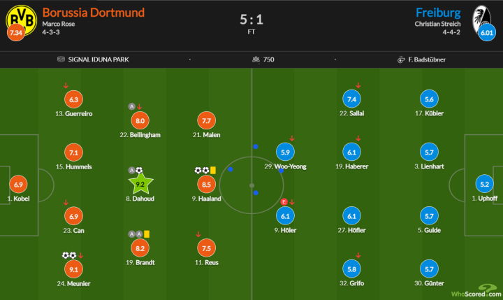 下半场伊始,施特莱希将上半场表现不佳的进攻线进行调换,德国U21主力沙德在替补出场后为弗莱堡提供了爆点,他的几次突破都给多特的防线带来隐患,正是他在比赛第61分钟主导的进攻帮助同样替补出场的德米洛维奇完成破门,此后弗莱堡更是有机会再下一城继续追赶,但哈兰德在15分钟后接达胡德妙传完成梅开二度,在打破自己两轮进球荒的同时也浇灭了弗莱堡反扑的希望为多特蒙德锁定胜局,助攻者达胡德也在随后收获进球,这也是他在上一场绝杀法兰克福后连续两场收获进球。