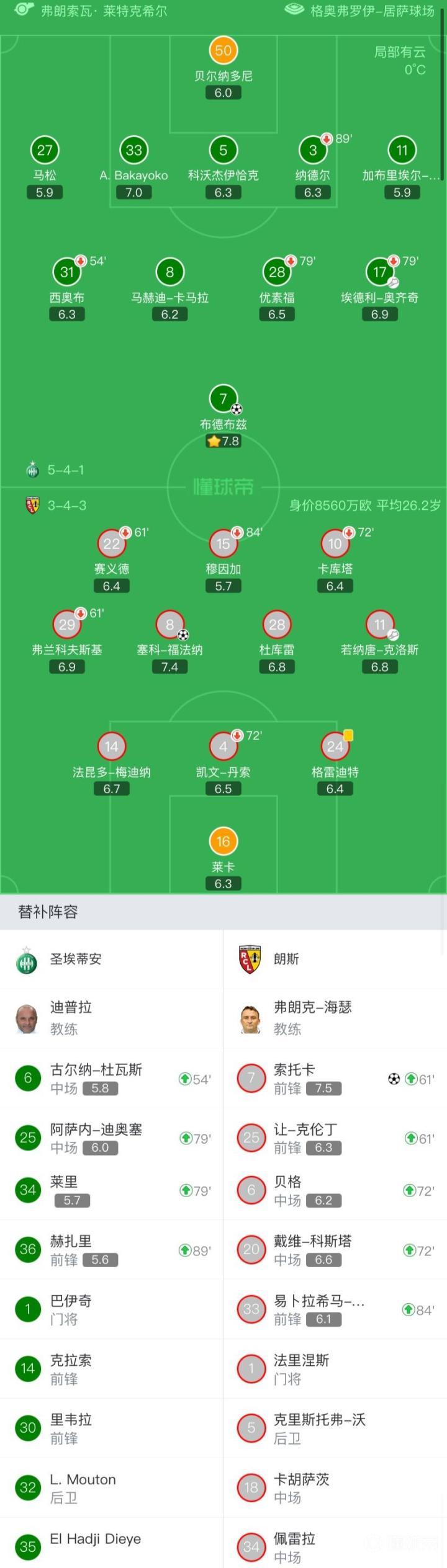 朗斯首发:16-莱卡、10-卡库塔、11-若纳唐-克洛斯、24-格雷迪特、8-塞科-福法纳、22-赛义德、29-弗兰科夫斯基、4-凯文-丹索、14-法昆多-梅迪纳、28-杜库雷、15-穆因加
