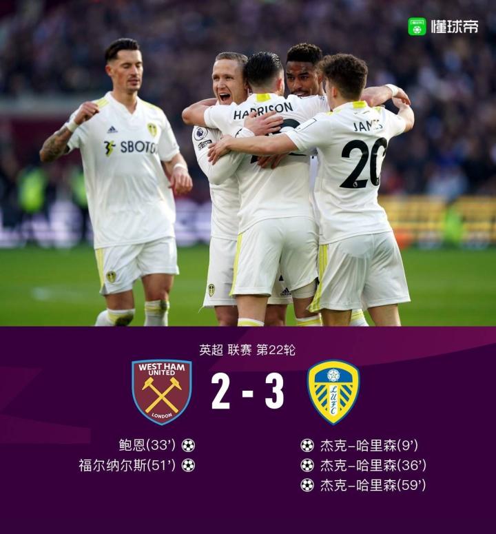 第59分钟,利兹联精彩反击,哈里森后点跟进完成帽子戏法,西汉姆2-3利兹联。