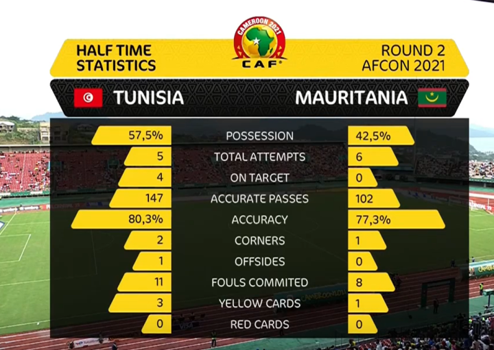 第4分钟,突尼斯前场抢断,在左路球权争抢中,毛里塔尼亚3号阿贝德·阿利一脚解围变成乌龙助攻,21号马特卢蒂迎球抽射破门!突尼斯取得梦幻开局,取得1:0领先!