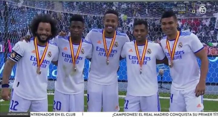 皇马西超杯夺冠,队内“巴西帮”在球场上合影留念ETChalmers @懂球帝2022-01-17 05:18皇马夺得西超杯冠军后,队内五名巴西球员在球场上合影留念。西超杯决赛,皇马2-0击败毕尔巴鄂竞技,夺得队史第12座西超杯冠军。颁奖典礼上,皇马5名巴西球员包括马塞洛、维尼修斯、米利唐、罗德里戈和卡塞米罗在球场上合影留念。展开更多