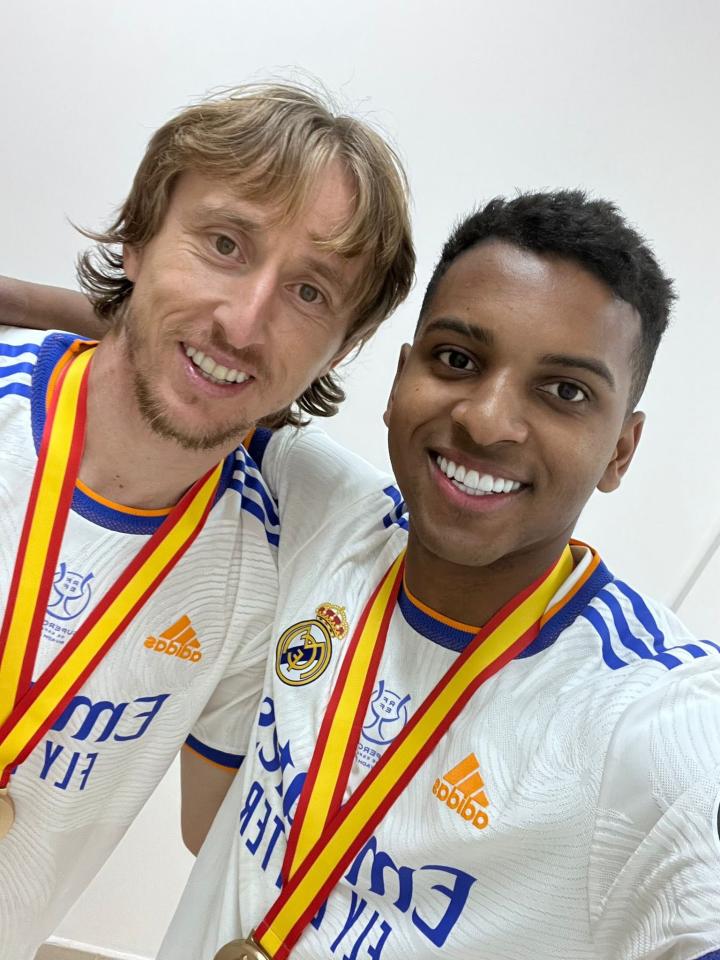 皇马西超杯夺冠后,21岁小将罗德里戈在个人社交媒体晒出他与莫德里奇的合照,并配文:爸爸。