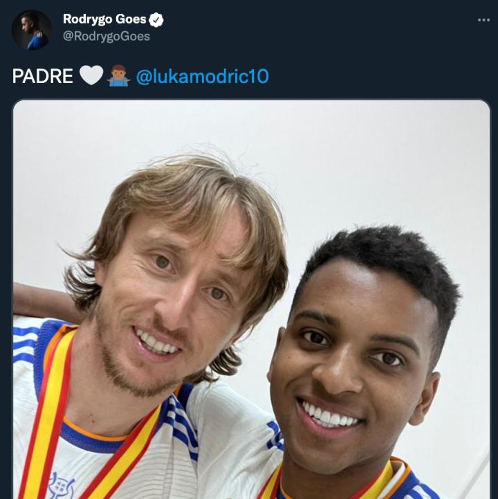 赛后,罗德里戈在个人社交媒体晒出他与莫德里奇的合照,并配文:“爸爸。”