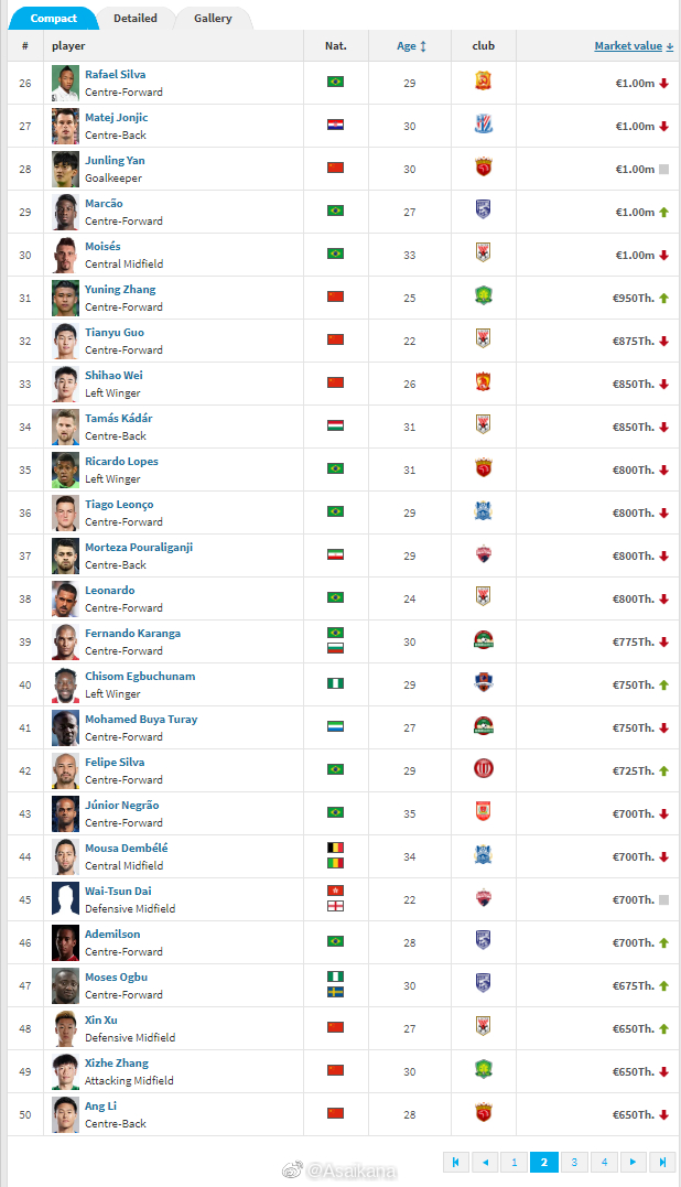 此次身价下跌最多的是上海海港的穆伊,他从之前的750万欧元变成了现在的500万欧元,下跌了250万欧元;申花的外援巴索戈从400万欧元下降到300万欧元、博拉尼奥斯从250万欧元下降到150万欧元,都是下跌了150万欧元。