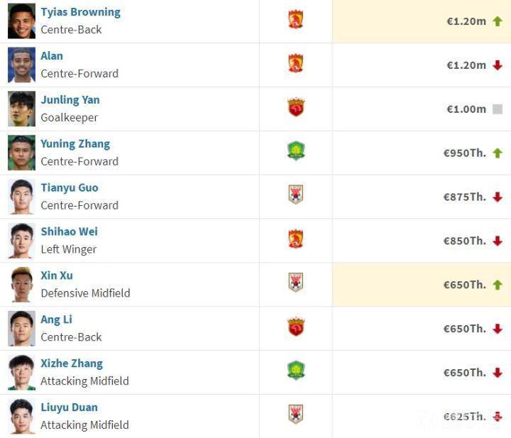 中超本土球员身价排行榜: