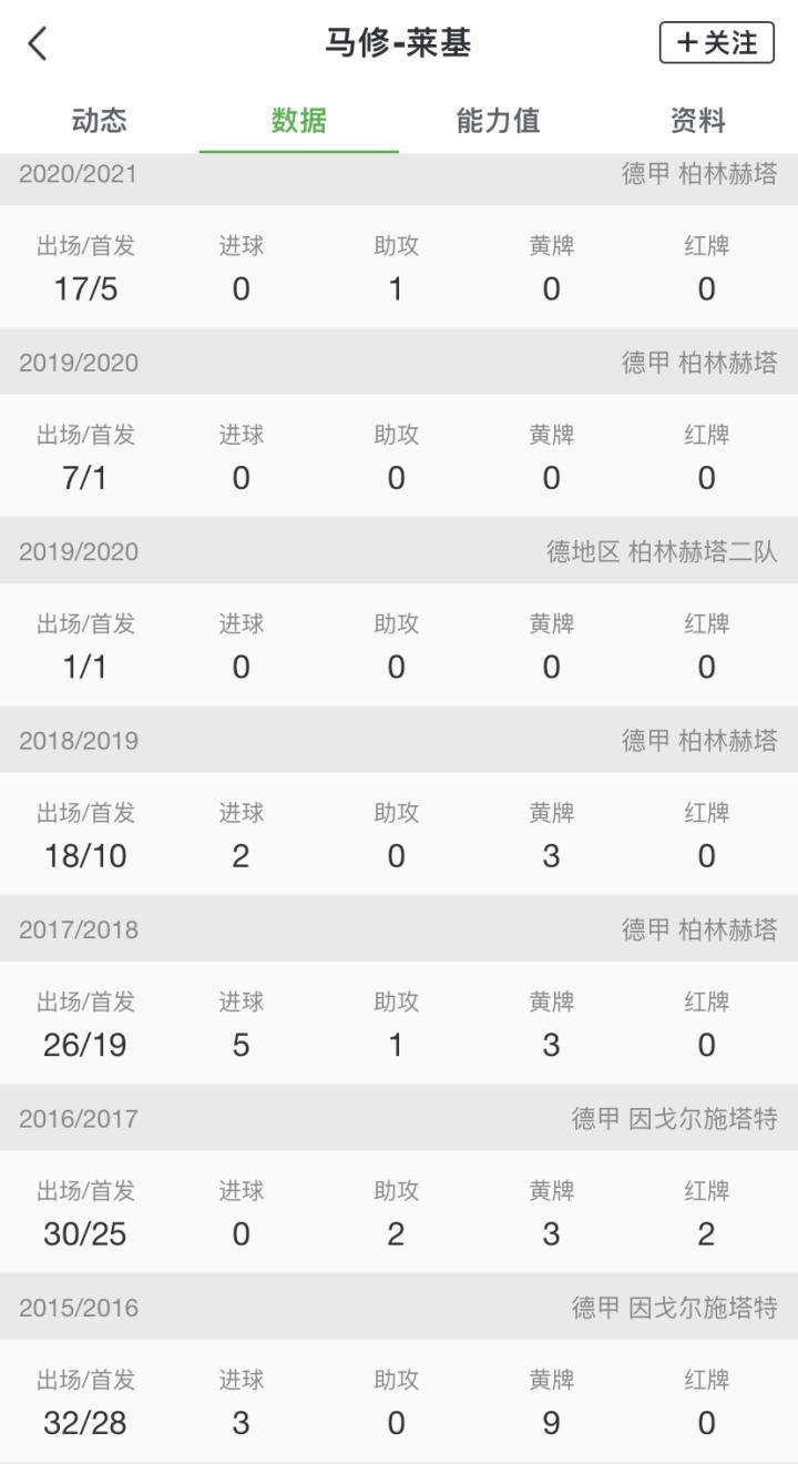 从2011年加盟门兴,马修莱基的德国生涯一踢就是十年,直到与中国队比赛前不久才回国;这十年间除了刚来的11-12赛季以及19-20、20-21赛季是替补,其余7年间,莱基作为主力踢了3年德乙和4年德甲。