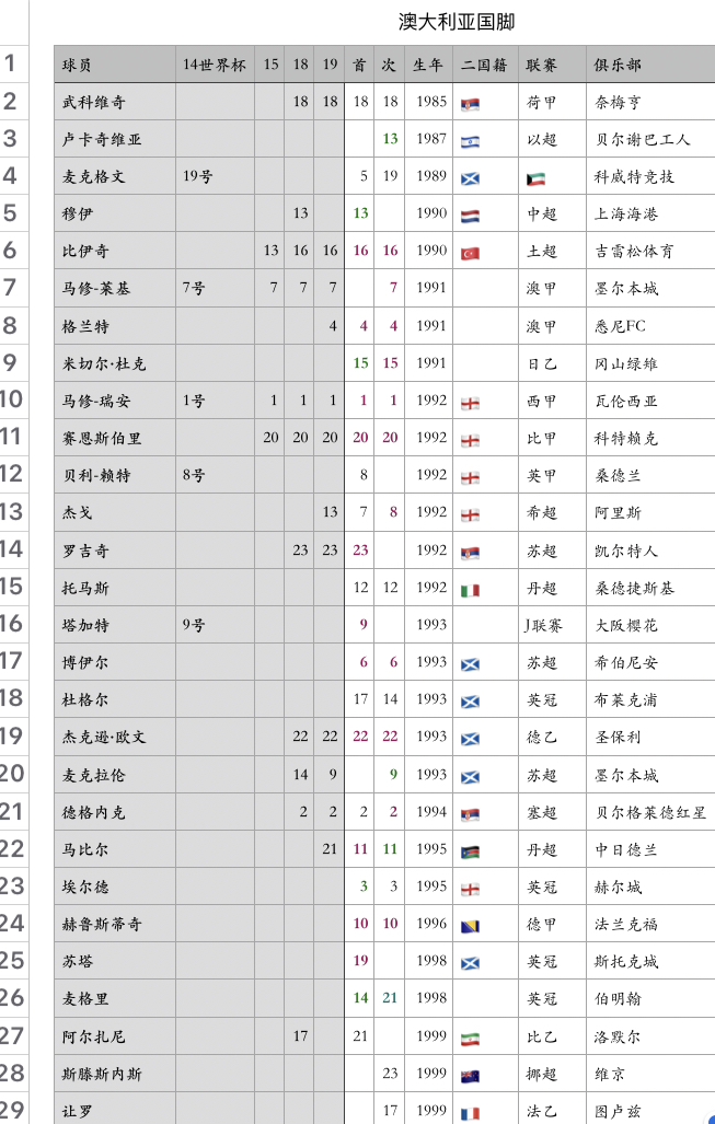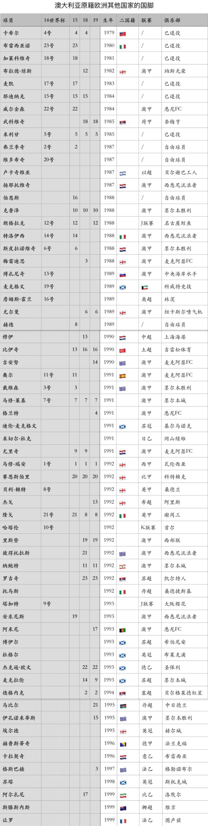 这张图记录了自2014世界杯以来四届大赛和两战国足的66名国脚,多达47人都有第二国籍,除了美洲,这些球员遍布亚、欧、非、大洋洲,苏格兰9人、英格兰8人、克罗地亚8人、希腊5人,意大利4人,塞尔维亚3人,荷兰2人,西班牙、法国、波黑、斯洛文尼亚、土耳其、伊朗、黎巴嫩、以色列、阿富汗、萨摩亚(卡希尔)、南苏丹各一人。这其中,拥有英格兰和苏格兰籍贯的球员要得益于语言文化的便利,而多达13名来自前南斯拉夫地区的球员都和90年代南斯拉夫内战有关,大量移民前往澳大利亚;马比尔更特殊,他出生在南苏丹的一个难民营,随父母来到澳大利亚,从小接受足球教育,并展现了惊人的天赋,20岁便被中日德兰球探带到了欧洲,效力至今。