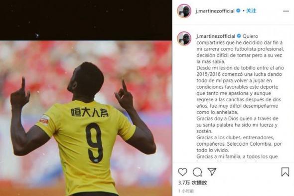 2020年12月8日,饱受伤痛折磨的哥伦比亚人宣布退役,他选用了自己在恒大效力时的照片。
