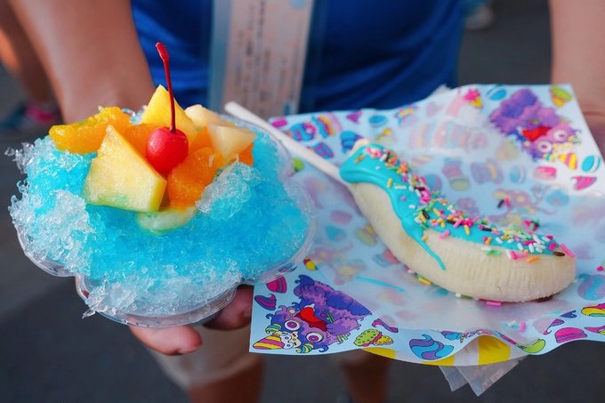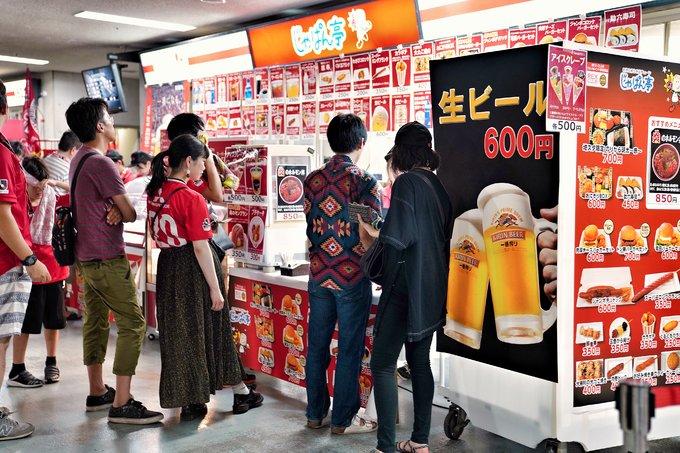 最后,也是球迷们最爱的企划——展现俱乐部自身魅力的球队特色美食。一般来说都是以颜色区分的,比如你可以在广岛喝到紫色的啤酒、吃到紫色的饭团。而在川崎自然会有天蓝色的香蕉和刨冰。遇到有钱的俱乐部都不需要你掏钱,比如19年夏天在大阪钢巴主场,给每位来场球迷送了蓝色封面的哈根达斯。